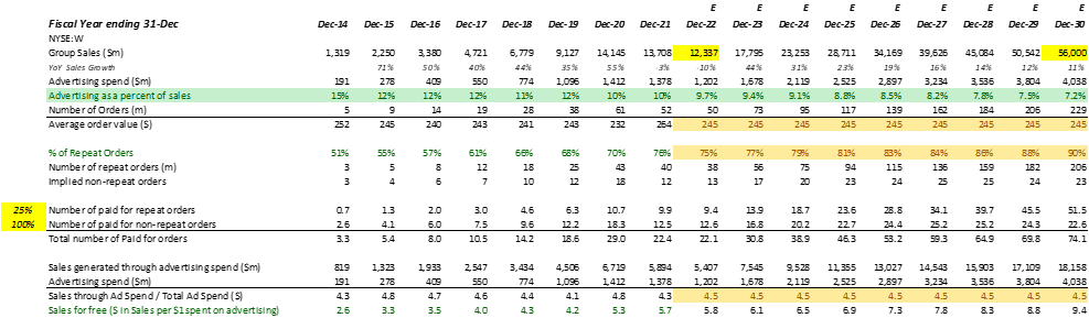 Wayfair’s free-cash flow yields are likely to expand from 1% in FY ‘21 to 8% by FY ’30 through expanding gross margins and reducing operating costs, as it continues to grow unit sales for suppliers and increases its base of repeat business.