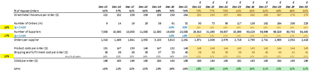 - A slowing growth in orders from 30% CAGR over the past 5 years to 18% CAGR over the next 9 years will grow annual order count from 52m in FY ’21 to 229m in FY ‘30