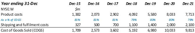 Product Costs are made up of the amount Wayfair owes suppliers for goods as well as inbound shipping costs – the cost to get the goods from the suppliers’ warehouses to Wayfair’s fulfilment hubs. Both costs benefit from scale: