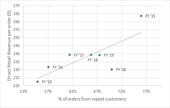 - Direct Retail Revenue grows in line with its historic relationship with percent of repeat orders