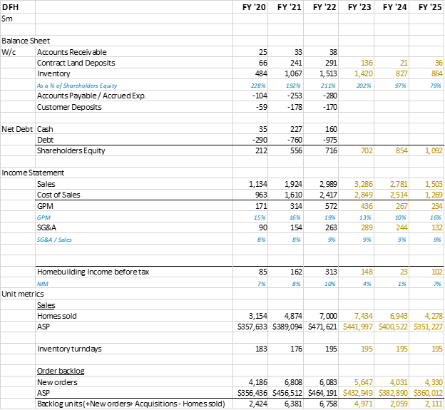 DFH’s current inventory is $1,500m (September 30, 2022), with ASPs of $470k, Cost at 80% of this, it implies DFH has ($1,500m / ($470k ASP * 81% CoS)) = 4,000 homes in inventory. With inventory turning every 195 days this implies DFH might sell roughly (4,000 * (365/195)=) 7,500 homes in FY ’23.