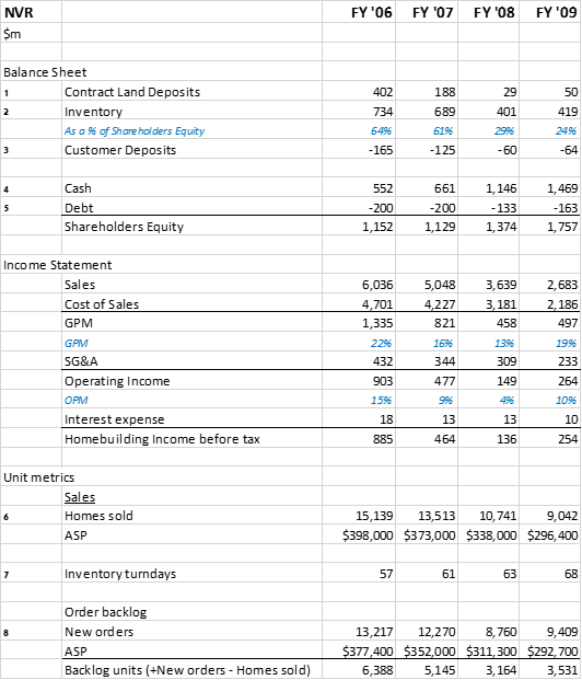 At the end of FY ‘06, NVR held $402m in contract land deposits [1] vs book value of $1,150m (c.35%). Over the subsequent two years, these deposits were written down by 93%: to $188m in FY ’07, then to $29m in FY ’08. These flow through Cost of Sales, compressing Gross Profit Margins.