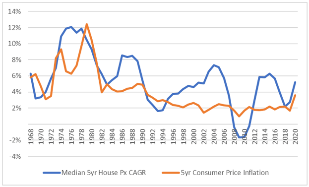 Exhibit 2: The rate of house price growth is almost always above inflation