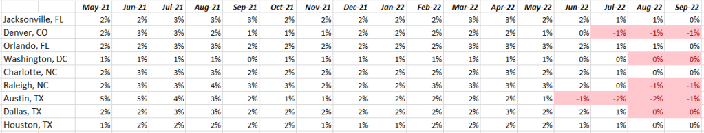 However in five of the states: Denver, Washington D.C., Raleigh, Austin and Dallas prices are off between 1-5% from their May-July highs. (Exhibit 3)