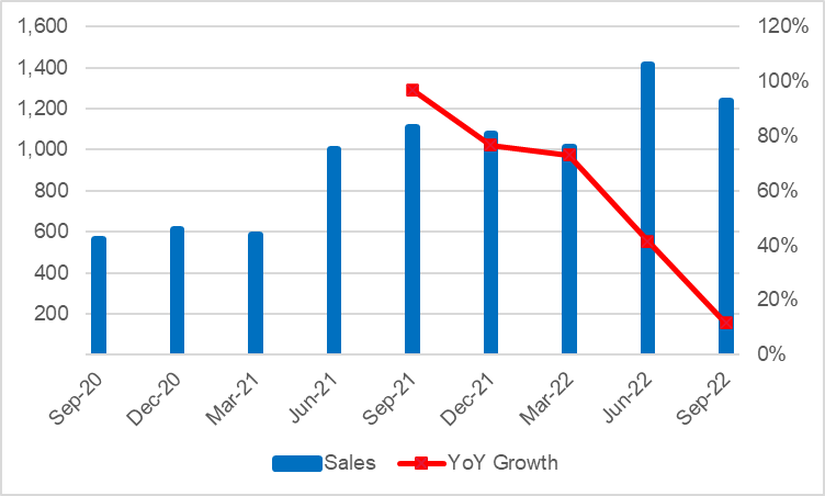 - Valuation: At $2bn, the company is currently valued at 52x earnings from Sep-21 to Sep-22 (Q4’22 numbers not yet released), and 60x free-cash-flow (Net Income plus depreciation and amortisation, less capex) over the same period. Given the year-on-year sales growth over that period has declined from 97% to 12%, the risk of a de-rating seem high. (Exhibit 2). With US house prices now declining in several cities, and mortgage rates high relative to disposable incomes, the risk is exacerbated.