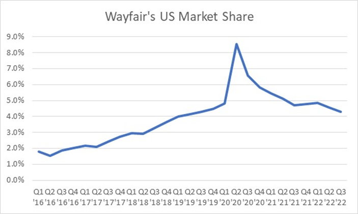 Exhibit 1: Wayfair has given back the market share gains it made during COVID lockdowns