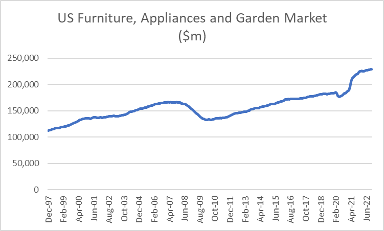 The US Furniture, Appliances and Garden Equipment market has shown slow but steady growth in recent years, with strong pick up in demand in 2021 (Exhibit 0)