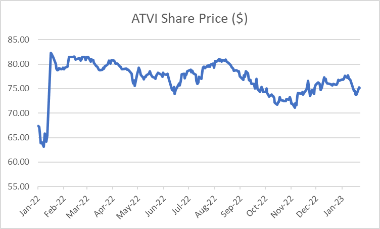 Exhibit 1: Concerns about the deal being blocked have caused ATVI shares to trade down