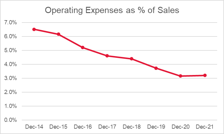 What’s more, the business is barely profitable. Operating margins hit a high of 1.5% in FY ’19, albeit up steadily from a low of -5% in FY ’14 (Exhibit 1).